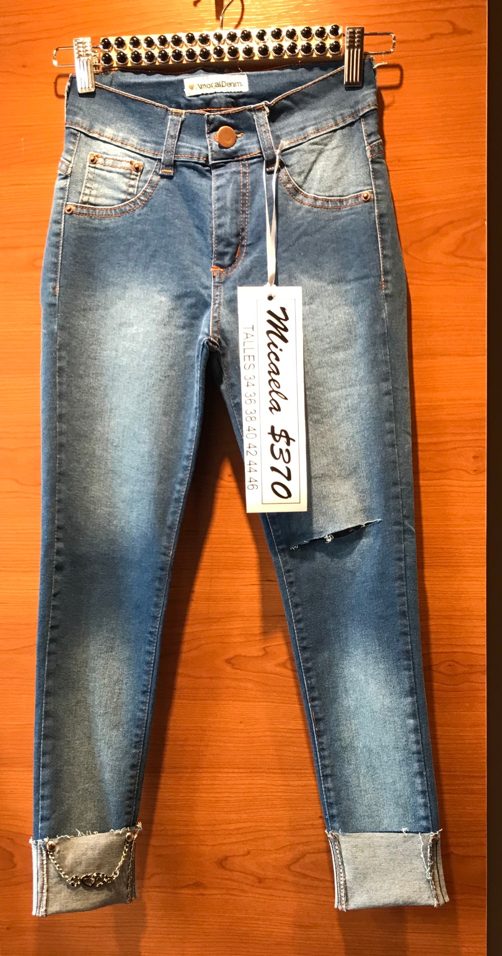Corsario con rotura en la rodilla y detalle de cadenita en un botapie.